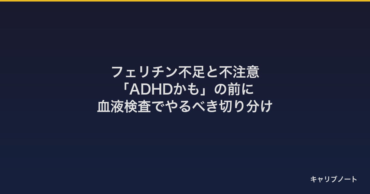 ADHDっぽい不注意・疲労の裏に、貯蔵鉄の低下が隠れていることがあります。対処の順番は「サプリを買う」ではなく「血液検査 → 医師相談」です。 ADHDの検査・診断・薬の検討と並行して、この切り分けをやっておくと、判断材料が一つ増えます。