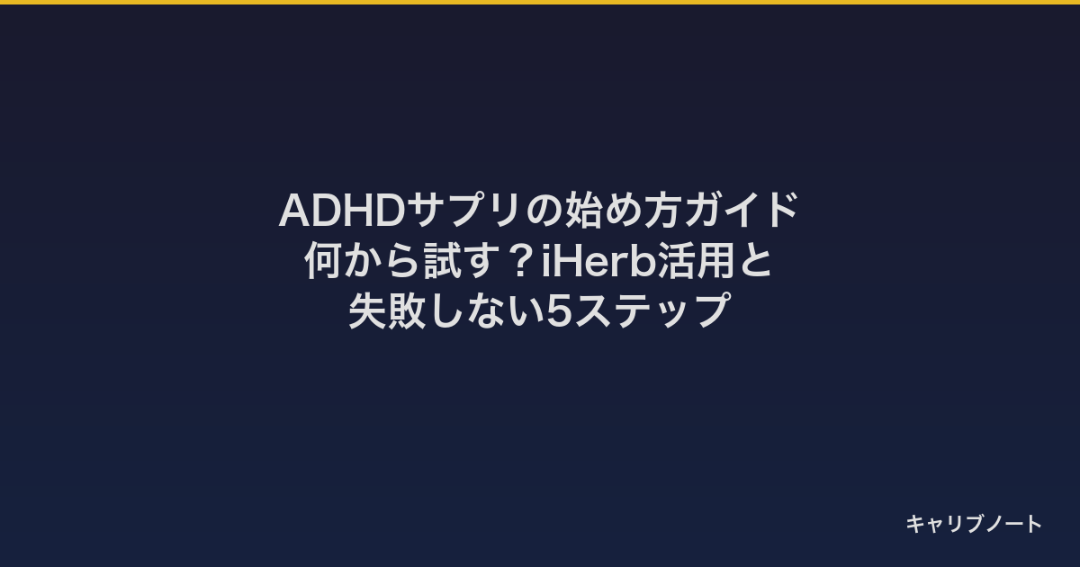 この記事は「ADHDにサプリ」と検索して情報過多になっている人に、失敗しない順序(5ステップ) を渡すためのガイドです。個別のサプリの詳細(鉄、ω3、マグネシウム等)は各専門記事に譲り、ここでは「始め方の地図」に徹します。iHerbの登録・使い方、最初の3ヶ月の推奨メニュー、やらない方がいいこともまとめました。