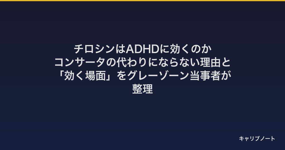 栄養全体の話は ADHDと栄養の関係|「サプリで治る」ではなく「欠乏が症状を悪化させる」を研究から読み解く に整理しています。チロシン以外の選択肢も比較したい場合は ADHD集中力サプリ徹底比較|「ランキング」ではなく自分に合う1つの選び方・6種類のエビデンス強度を公開 、合法スマートドラッグ全般に関心があれば 「スマートドラッグ」は日本で合法?|成分別・4段階分類と合法な代替サプリまで法律ベースで整理 、カフェインと組み合わせたい場合は L-テアニン×カフェインの集中スタック|コーヒーでソワソワする大人の現実解と比率・耐性対策 も参考にしてみてください。そもそも自分がADHDかどうかから整理したい場合は 「自分は発達障害かも」と思ったら最初にやること から読み直すのが近道です。